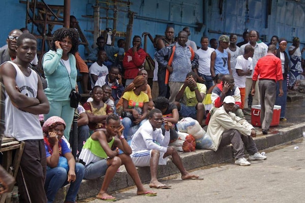 People wait for Liberian security forces to allow them to deliver foodstuff to friends and family members in the West Point area that has been hardest hit by the Ebola virus spreading in Monrovia, Liberia, Monday, Aug. 25, 2014.Abbas Dulleh/The Associated Press