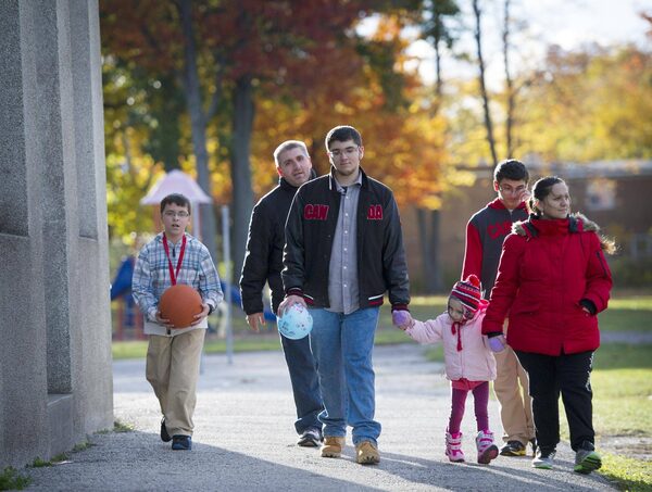 The Sarkozi family, from left, Alex, 10, father Laszlo, 37, Laszlo Jr., 15, Jennifer, 3, Miklos, 14, and mother Ilona Orsos, 35, stroll through a park near their Toronto home on Sunday. The Sarkozis came to Canada from Hungary as asylum seekers in 2011.Kevin Van Paassen/The Globe and Mail