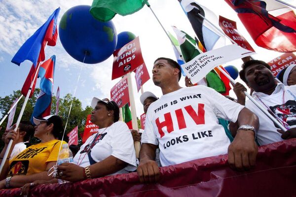 Marco Benjamin, 32, of New Brunswick, N.J., second from right, who is HIV positive, walks in the AIDS March in Washington, Sunday, July 22, 2012.Jacquelyn Martin/The Associated Press