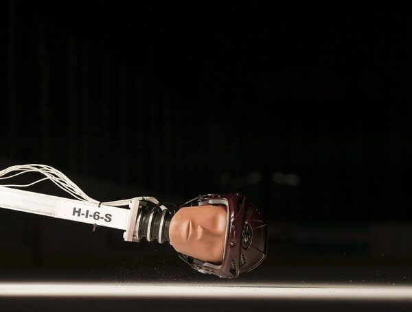 A pendulum swings a dummy head wearing a hockey helmet into the ice for testing at the Roanoke Civic Center in Roanoke, Va., Jan. 15, 2013.RYAN STONE/The New York Times