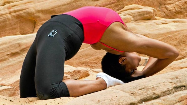 Measha performs an advanced version of the camel pose on the Hidden Canyon Trail, Zion National Park, Utah.Alex Gardner