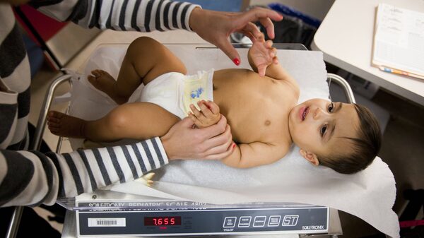 Nine-month-old Vivek Mehta is places on a weight scale by mother Manisha Mehta during a visit to the St. Michael's Hospital Paediatric Clinic in Toronto Feb. 14, 2012.