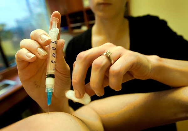A registered nurse injects a dose of the H1N1 flu vaccine at a Toronto health clinic on Thursday, October 29, 2009Darren Calabrese
