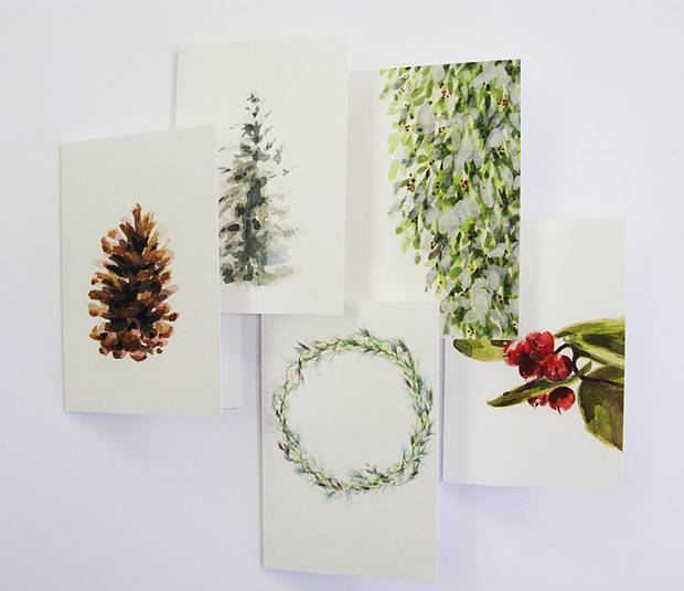 This year, she has made holiday cards from original and simple watercolour paintings of a holly twig, a wreath, a pine tree and a pine cone, using the same scanning and printing process. "A card is a really accessible and affordable way to have artwork," she says. "I love the tradition of sending cards for the holidays and special occasions. There's something sacred about it."