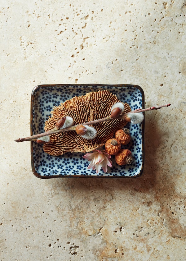 A Japanese porcelain dish with mushroom, pussy willow, Italian ruscus berries and helichrysum.Paul Chmielowiec/The Globe and Mail