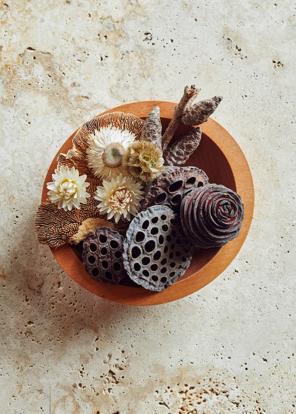 A wooden bowl with lotus pods, scabiosa pod, mushroom, helichrysum (straw flower), honey dip and pine cones.Paul Chmielowiec/The Globe and Mail