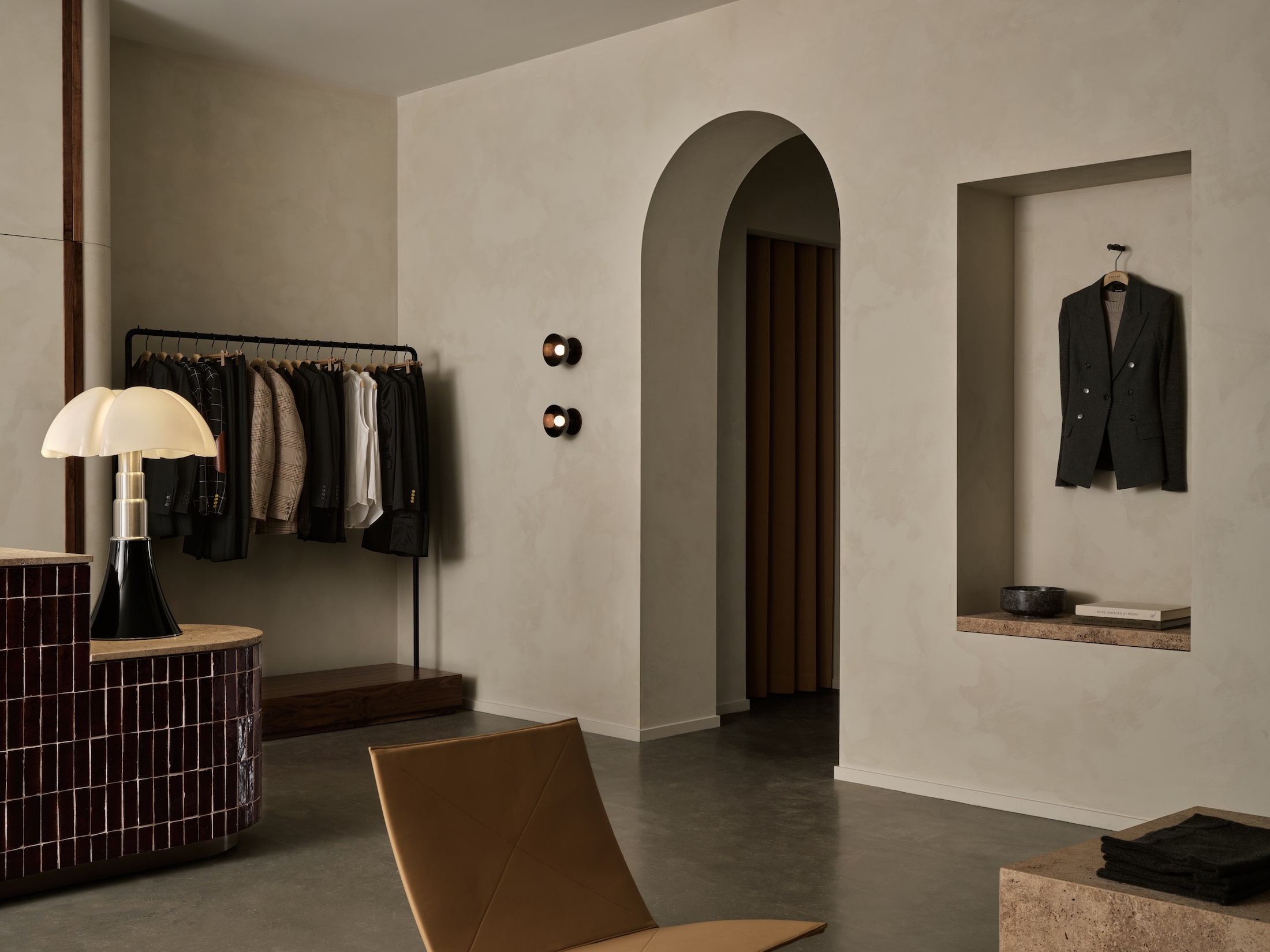 With lime-washed walls, port-coloured tiles and a vintage Pipistrello lamp by trailblazing Italian female architect Gae Aulenti on the cash desk, the women’s-wear space infused its corner of the sixties-era mall with a dose of contemporary chic.