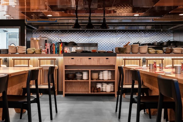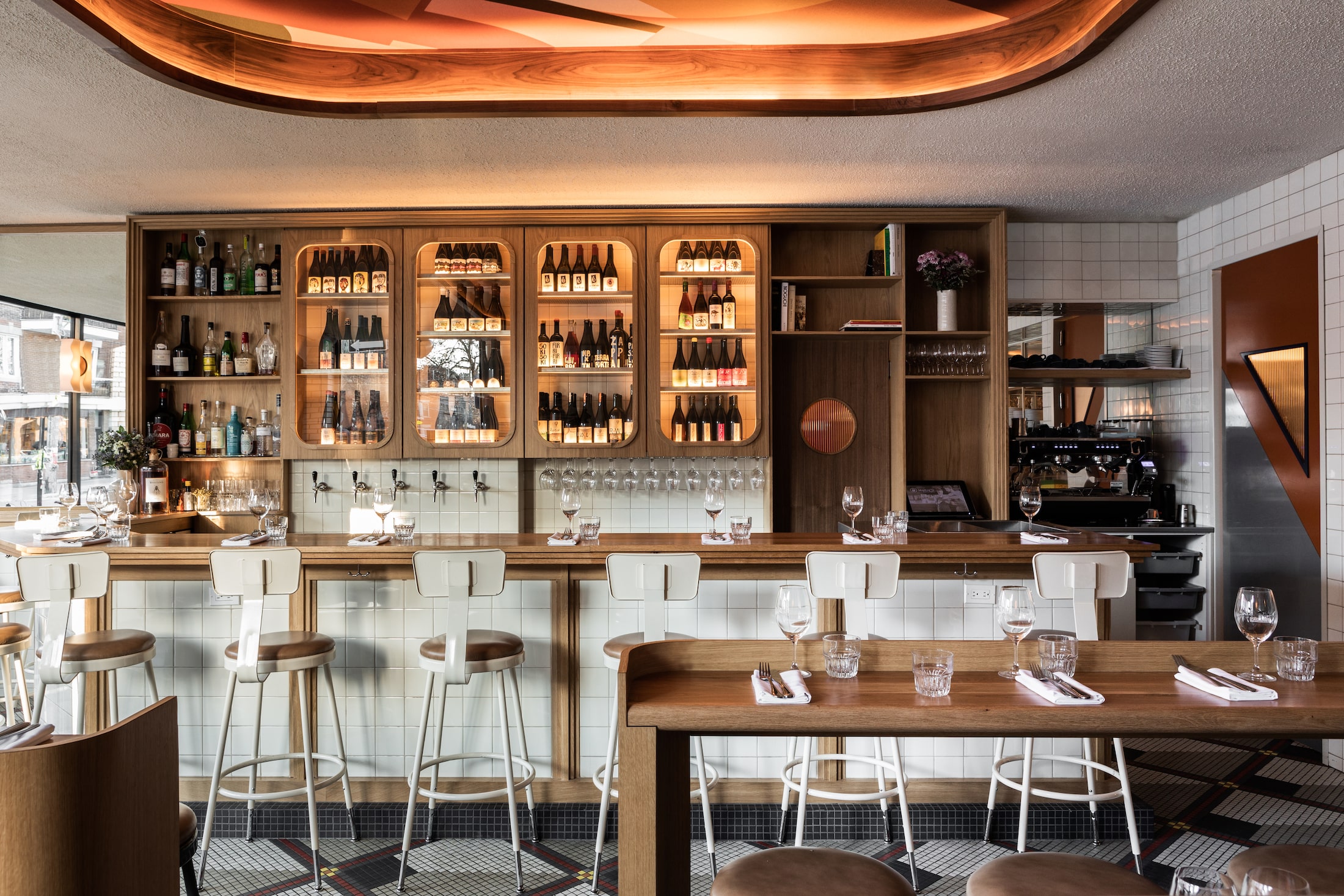 Instead, the open kitchen’s ceiling is covered in copper sheeting to provide a lantern-like glow. A feature wall behind a long communal table is awash in a mural by artist Doris Lee, which tells the story of a chef’s journey through diverse landscapes to discover a sense of unity.