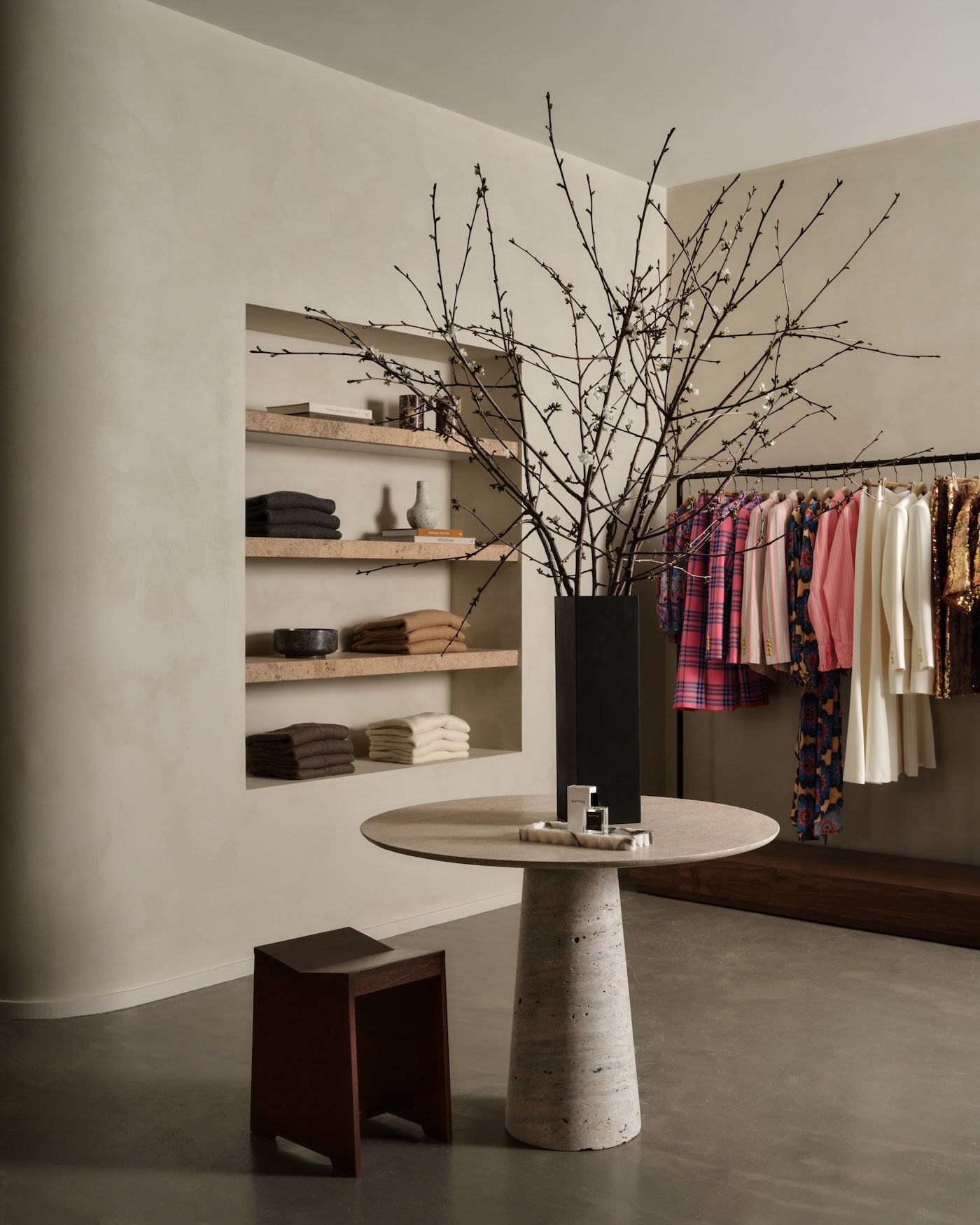 “A round stone entry table with flowering branches greets you when you enter, there is custom seating area to anchor the space and a rounded cash desk reads more like an island you want to hang out at.”