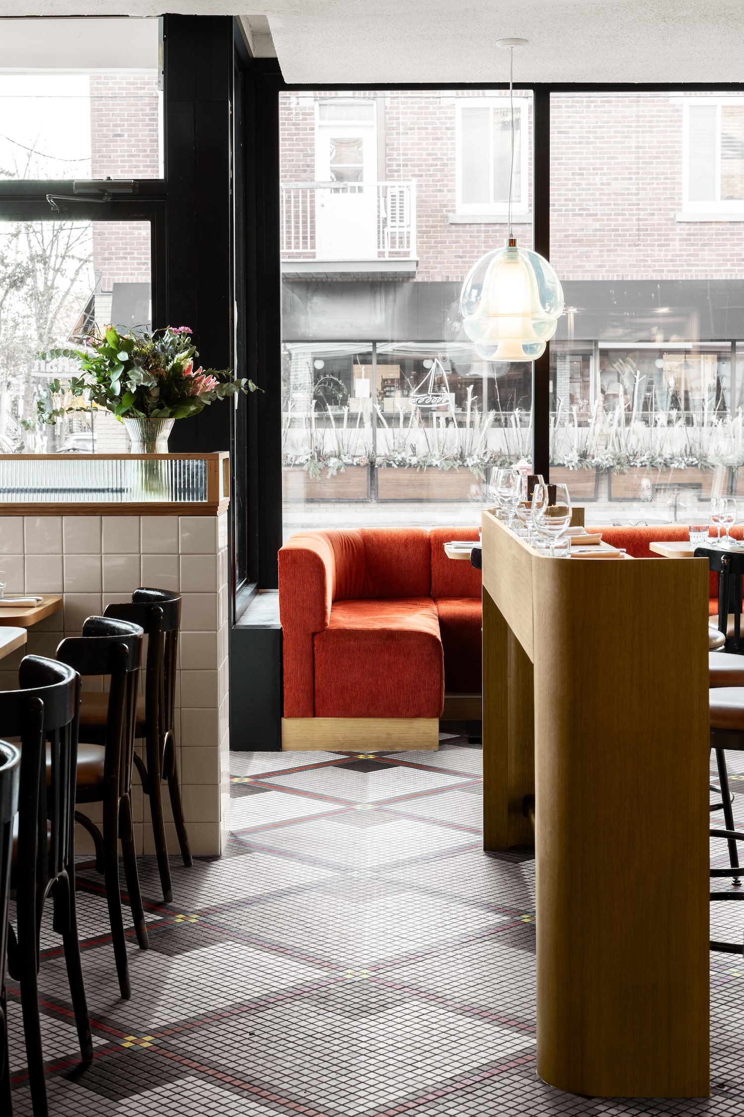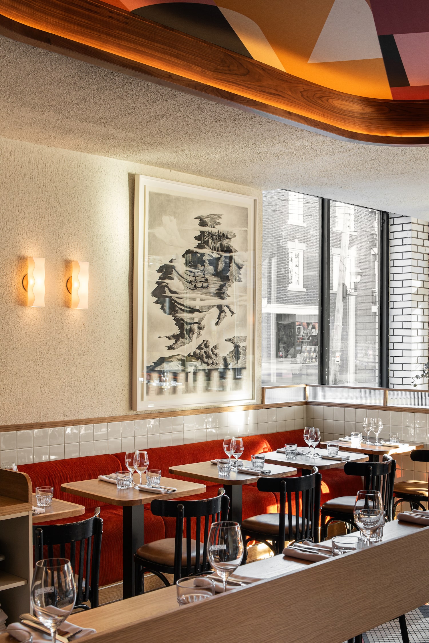 For the mosaic tile floors, a standout in the space, Ménard took inspiration from a classic French bistro checkerboard pattern, reinterpreted with intersecting red lines. On the ceiling, the team turned a practical need for acoustic tile into a visual highlight.