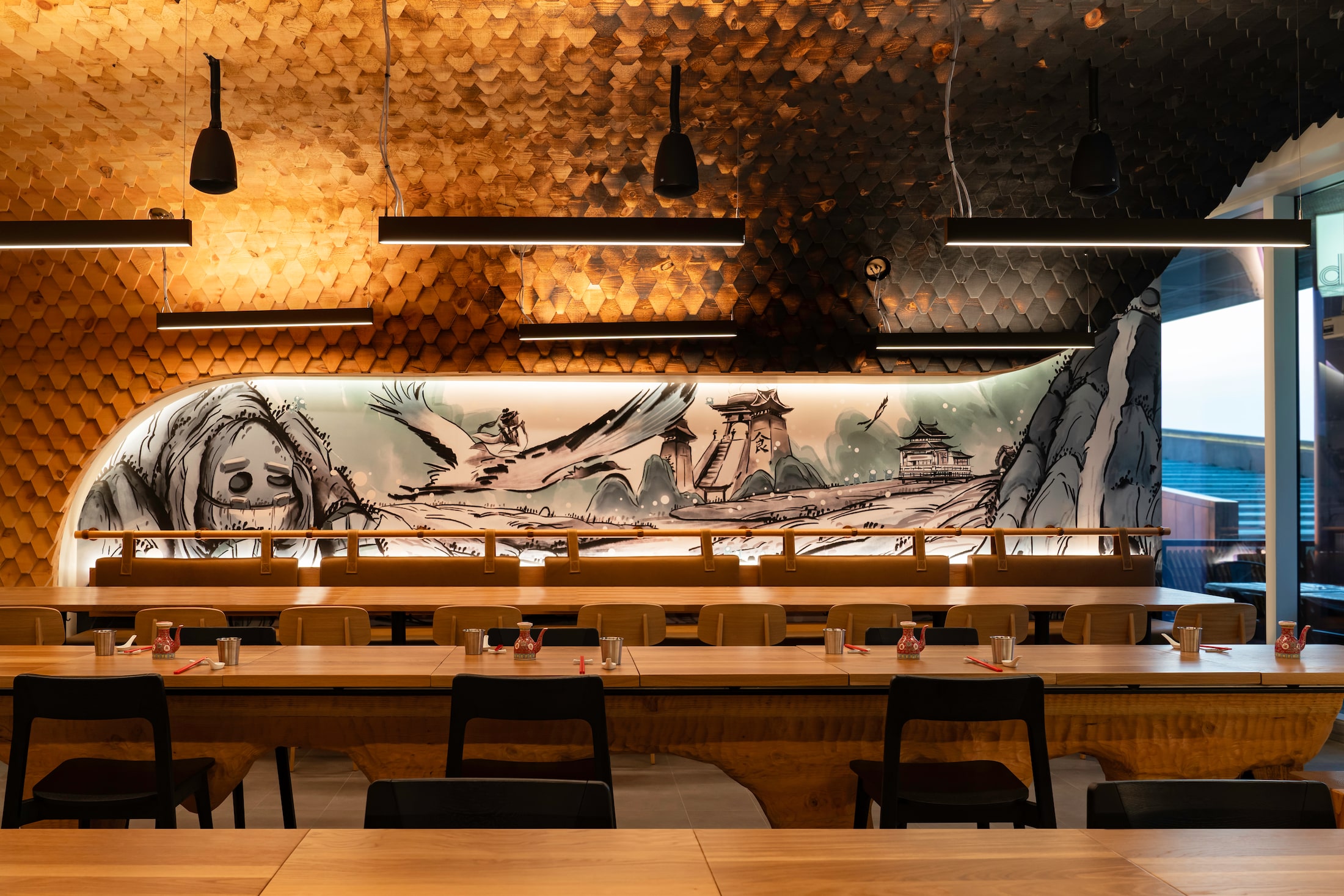 For Toridori, a new pan-Asian restaurant in the city’s mixed-use Queen’s Marque development that is operated by Freehand Hospitality, Wünsch and director of design Aaron Hughes envisioned something unexpected: “We called it, ‘When anime becomes architecture,’ ” Wünsch says.