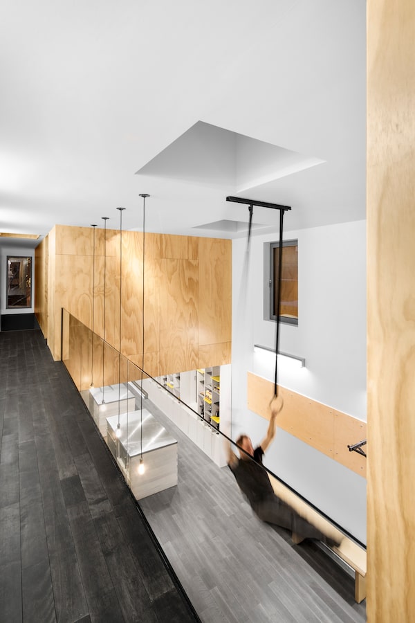 A home designed by Montreal studio Naturehumaine features gymnastics rings hanging where the dining room would be.
