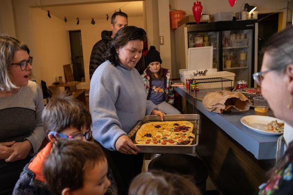 Amy Chung, in charge of the bread, serves a homemade focaccia with veggies.Anabel Burin/The Globe and Mail