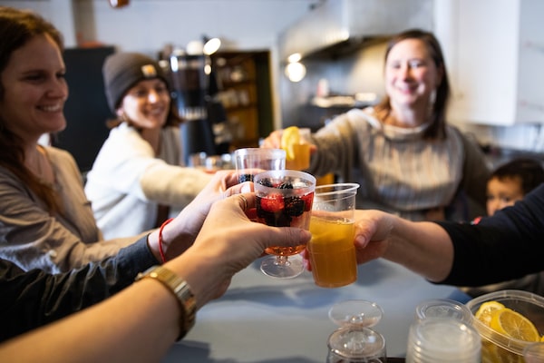 Members of a monthly dinner club organized by Montreal food guide and cook Melissa Simard do a toast with some homemade sangria and kombucha.Anabel Burin/The Globe and Mail