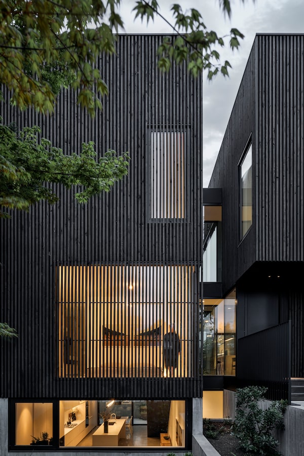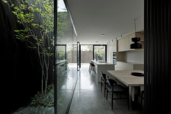 Designed by architects Leckie Studio and interior designers Gaile Guevara Studio, the dwelling presents restrained form to the street: It is a black box whose vertical slats half-conceal expanses of glass. A narrow slot courtyard cuts lengthwise down the centre, its surface planted with small trees and ground covers. Out front, a lush garden steps down toward the lower-level suite and up half a level to the front door.