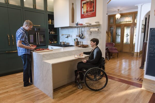 The architects and clients had to make major changes in order to provide full access for Phillips, while at the same time preserving many of the original features of the 1907 interior. The main-floor kitchen was fully renovated to make space for a wheelchair, and to provide cabinets and shelves that Phillips could reach comfortably. ADHOC rebuilt the principal bathroom with an accessible shower and a counter under which a wheelchair can fit.