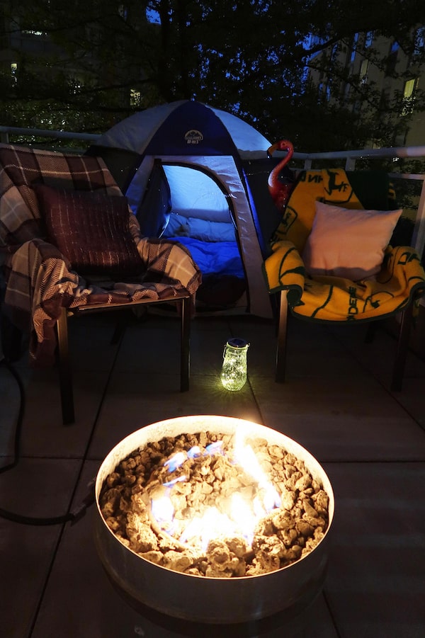 Vancouver-based Alison Hodgins agrees. She and her roommate recently set up camp on their 250-square-foot balcony. They decorated it with fairy lights, stuck a pink flamingo in a pot to represent wildlife, cooked five different flavours of s’mores over a small propane fire pit, and watched a rom-com under an electric blanket in their tent.