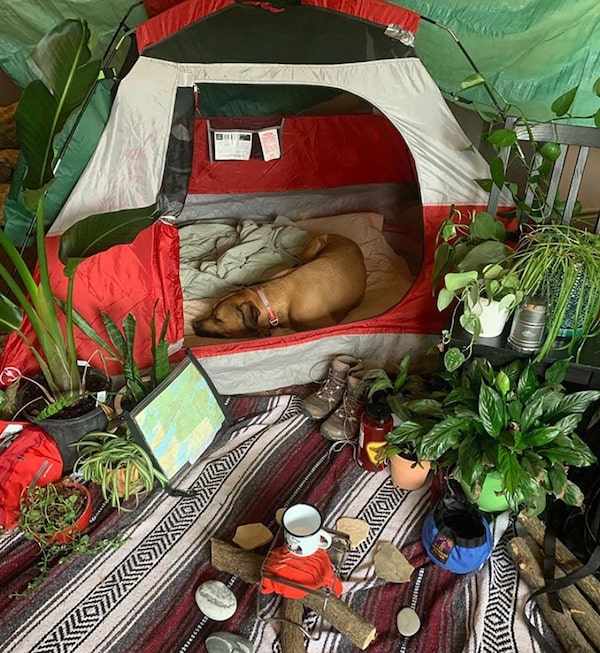 Some dressed in full camp garb, including wearing headlamps. Others built miniature camps out of Lego. One particularly enterprising couple in Banff, Alta., constructed a campsite for their pet lizard and took a photo of him lounging in a mini-hammock with a blown-up image of the glacially fed Moraine Lake as the backdrop.
