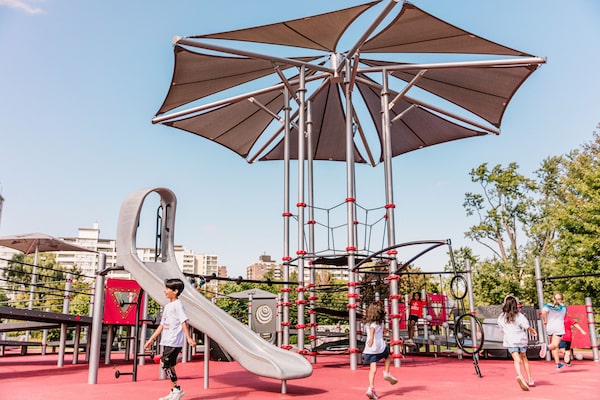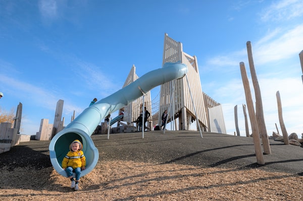 Some of the best examples of these, as my kids will vouch, were built by Earthscape Play, a company based in Wallenstein, Ont., a short drive from Kitchener-Waterloo. Earthscape helped create Toronto’s Grange Park, which takes inspiration from its location near the Art Gallery of Ontario, incorporating elements of an artist’s studio with an array of areas for children to climb and explore. Then there’s Toronto’s St. James Park, which uses its proximity to St. Lawrence Market to create food-themed play experience, featuring giant asparagus stalks for climbing and a life-sized ice cream cone that has spilled, giving children the chance to crawl through it and jump on the small, spongy hills next to it that were made to resemble scoops of ice cream. Many of the play structures Earthscape brings to life include intricate, complicated places for kids to climb and move through.
