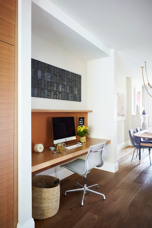 Having a secondary desk space on the main floor offers flexibility for both McNair and her son. Here, a commissioned work of concrete braille tiles by artist Dennis Lin anchors a floating oak shelf-style surface.