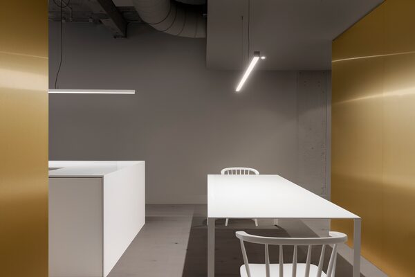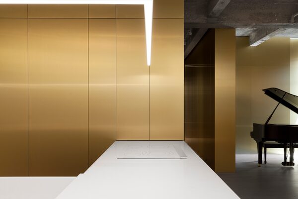 One of Verveille’s recent clients is a Montreal music composer “who needs calm.” Fittingly, the resulting condo is purpose-built for a hermetic, insular artist. Rather than an expansive dining room for dinner parties, there’s a place for one person to sit and play a grand piano. The eating space can seat a couple of people, max. The starkly minimal, though brassy, walls reinforce the intimate, inward-looking feeling.