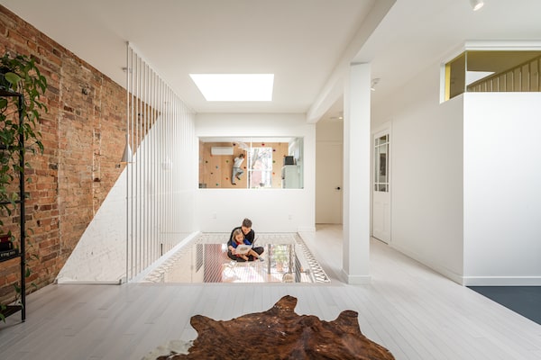 To achieve an airy, outdoorsy feel in a narrow row house, Charron turned to the roof. Skylights punctuate the second floor, letting sunshine filter down through an atrium net made from a repurposed catamaran mesh. The net, from French company Filet de Catamaran, is strong enough to support people and creates a mezzanine-like experience without sacrificing floor space. “It’s a way to feel free, even inside,” Charron says. “Lying on the net, looking at the sky through the skylight – it’s just like being outdoors.”
