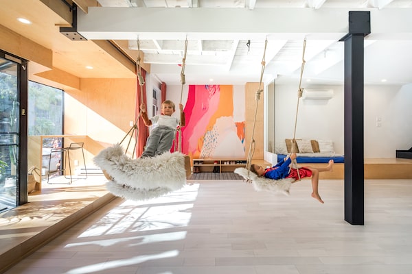 Even the most imaginative design still needs to function. “At the end of the day, the house still has all the essentials – a kitchen, living room, office,” says Charron. “And every playful feature is placed apart from the others to keep things balanced.” She also considered comfort: sheepskins, such as Ikea’s Ullerslev throws, soften the wooden swing seats, blending coziness with fun.