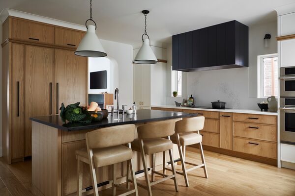 Charron’s solution involved adding swings, a slide and a rock-climbing wall to a converted duplex in Montreal’s dense Plateau neighbourhood. “We really worked on making a house that is playful for both kids and adults,” she says. Maple cabinets evoke Canadian cottages, while white-washed cherry floors give the space the feel of a Scandinavian cabin.