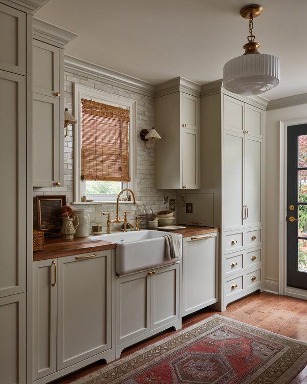 Authentic fixtures help evoke a cottage feel, particularly when they come with a bit of history. “The sink is from Shaws, an old British company,” says Botrie. “The faucet is from Perrin & Rowe, another long-standing U.K. maker.” But sourcing classic pieces wasn’t enough – Botrie emphasized craftsmanship with charming custom details. “We used stone offcuts from one of our suppliers,” she explains. “A slab sits under the faucet and lines the base of the sink, forming a little shelf. It’s a detail that protects the surrounding wood, but also something beautiful and rustic.”