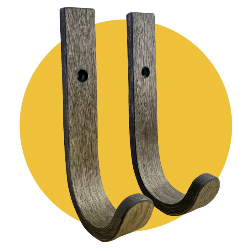 The Bent Wood wall hook is both sleek and rustic. Its understated J shape can carry coats and scarves. The material is moulded plywood, with an intriguing grain that adds a nice texture to entryways and mudrooms. Made in Quebec by Noir et Bois.