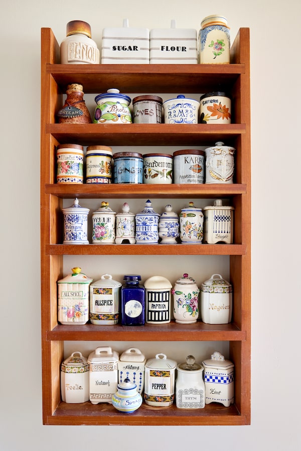 When travelling, Waverman visits flea markets to score vintage herb and spice jars for her collection. She displays them on three wooden racks (one shown here) and says the opaque glass protects dried herbs from light, which makes them lose flavour and disintegrate.