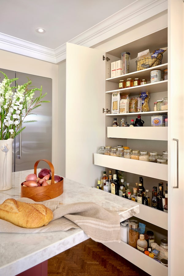 Waverman devoted seven feet of floor-to-ceiling wall space to two pantry cupboards. In each, the bottom four shelves pull out. This system allows her to store a wealth of globe-spanning specialty ingredients within easy reach. The side-by-side column refrigerator and freezer are from Fisher & Paykel. The apartment’s original herringbone floors were repurposed and moved from the bedroom, where Waverman and MacDougall decided to install carpet.