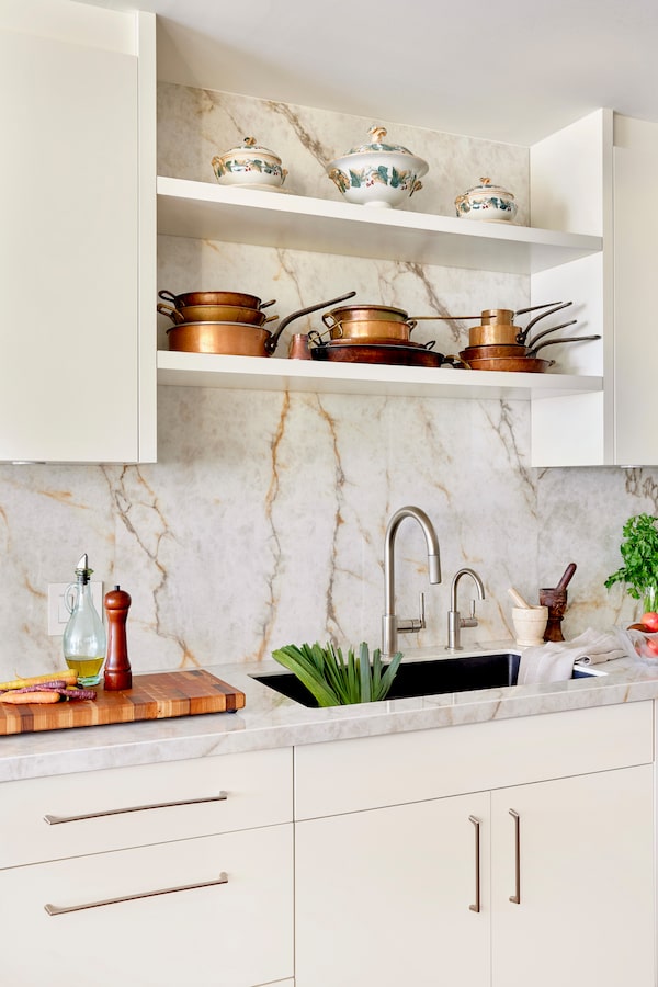 Wrapping the durable and easy-to-clean porcelain counter slabs up the wall keeps the room feeling luxe and light-filled. The porcelain’s veined pattern mimics marble and creates a stunning backdrop for Waverman’s copper pots: “Each of them has a history,” she says. “Some I bought in Paris, and some came from my mother, so they’re special and I like to see them on display.”