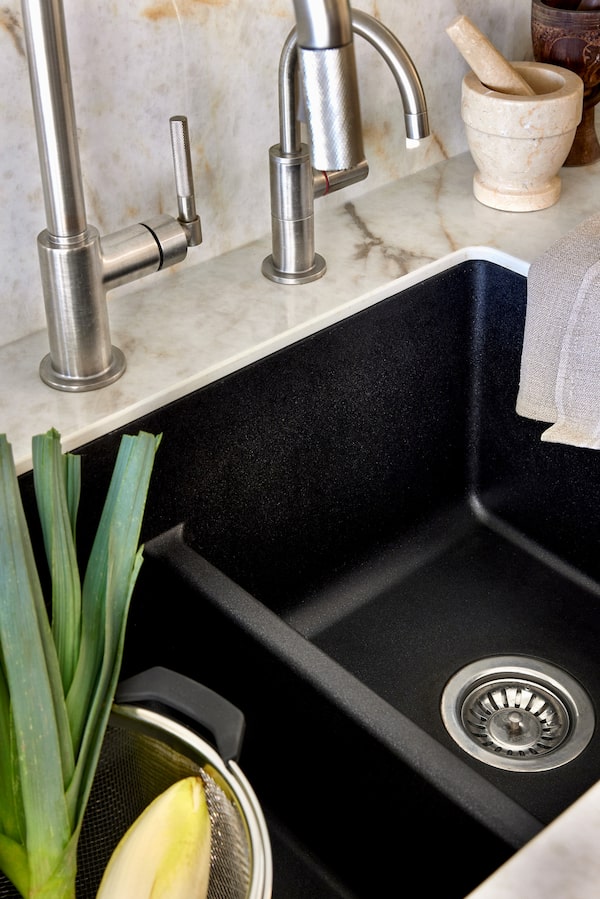 Waverman wasn’t keen to have another stainless-steel sink: “My old one looked pristine for about a week, and then it was scratched.” She spied these Blanco resin sinks at the Interior Design Show in 2019 and decided that’s what she would install if she ever moved. Fast-forward to 2022, and the stain- and scratch-resistant sink – in a purple-black colour called “Aubergine” – is a functional and dramatic feature.