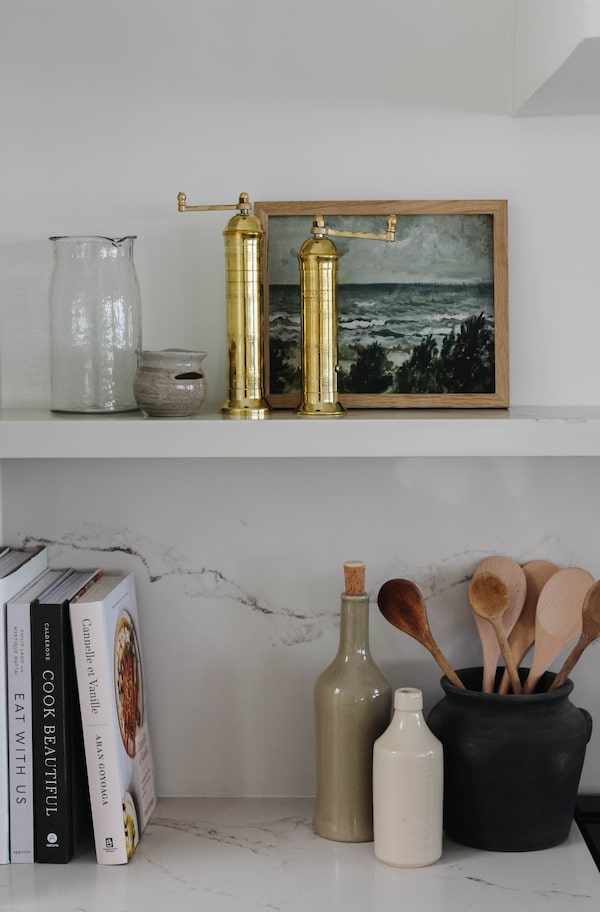 While digging through a thrift shop for treasure might only seem like a pleasing practice for maximalists, those more inclined toward cleaner interiors can find a sculptural ceramic or simple glass vases to lend interest to an empty space. A small grouping of similar pieces is the perfect thing to have on your thrifting shopping list. It’s a subtle interior addition that you can assemble over time with inexpensive finds.