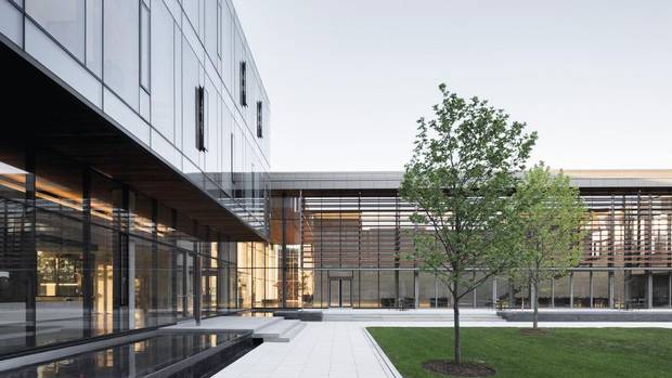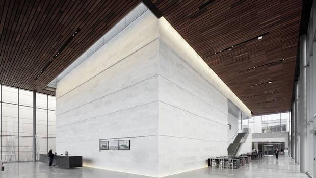 I saw this at their second building to win a G-G this year: the Centre for International Governance Innovation, a think tank in Waterloo, Ont. Its design, led by Blumberg, includes a bell tower – rectilinear, and a strong visual beacon. The building faces the street with a giant porch, formed by a wall of limestone and a broad ipe-wood overhang. From here, you can look right into the foyer – and into a quadrangle at the centre of the complex. This is a hallmark of KPMB buildings: They create, or improve, spaces for the public to gather.