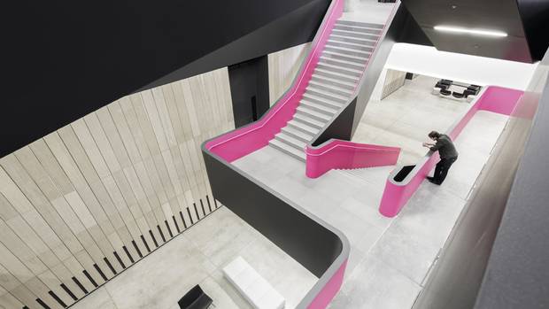 Inside the 'vertical campus,' a hot-pink stair provides a place to gather and mingle. The student lockers, in the background, were custom-made.