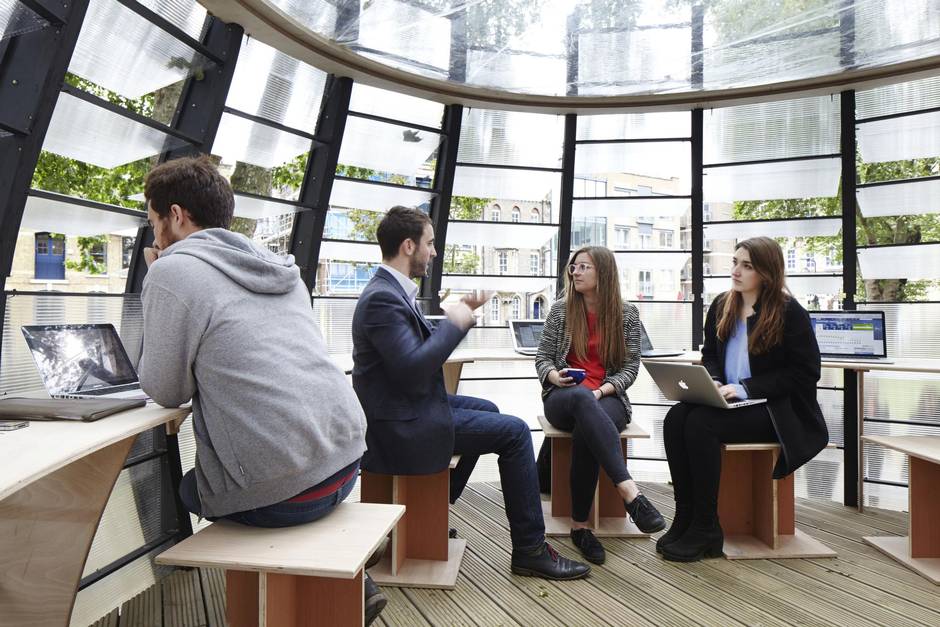 Australian-American artist Natalie Jeremijenko created the project in collaboration with artists Shuster + Moseley and architecture firm Tate Harmer. The temporary structure, commissioned by Artsadmin and Groundwork London, has a frame made of compressed paper and timber, kitted out with transparent plastic louvres that can be lifted open to let in the full glory of the sun’s rays, or pulled down to diffuse glare. Individuals or groups can book space – for £15 or £120 ($29.50 or $235) for a half-day Monday to Friday, respectively; local community groups have free rein on weekends – at the wraparound desks, with access to a power supply and WiFi.