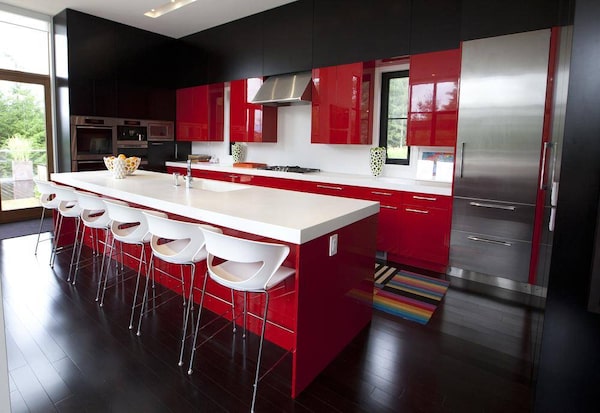 The kitchen provides a jolt of colour with cabinet doors lacquered in lipstick red.Deborah Baic/The Globe and Mail