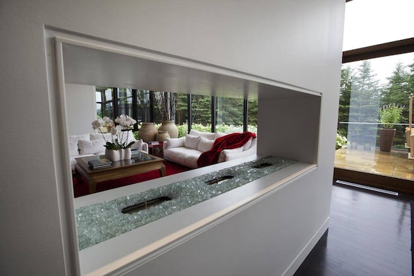 The living room accommodates large gatherings and provides views of the gardens and forest. A two-sided fireplace stands between the living room and dining room.Deborah Baic/The Globe and Mail