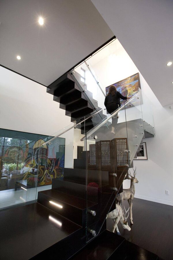 The staircase of glass, wood and metal sits on the east-west axis of the home.Deborah Baic/The Globe and Mail