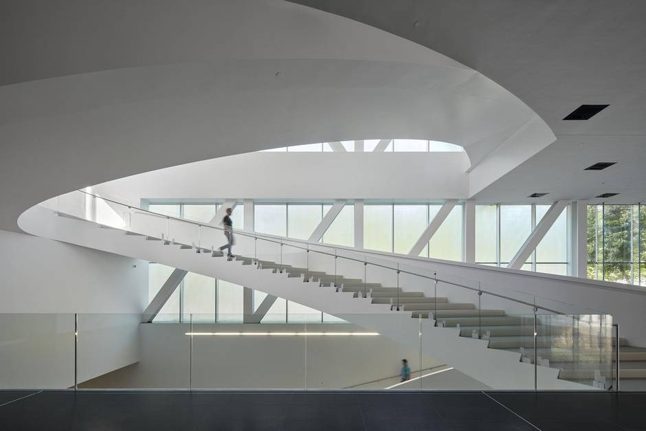 The stair expresses the central tension of the building. “There are moments when you can see the movement of people,” Shigematsu says, “and moments when you see the sculptural quality of the stair itself.”