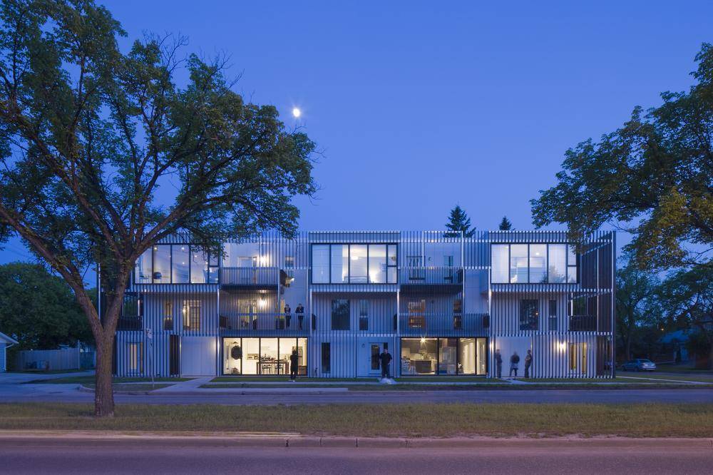 Another new project, on Winnipeg’s Stradbrook Avenue, is a walk-up apartment building, straightforwardly constructed, and then wrapped in a skin of reflective glass panels that sit, overlapping each other, on exposed clips. The reflections of the leafy street trees shimmer on the facade. This building is improbably pretty.