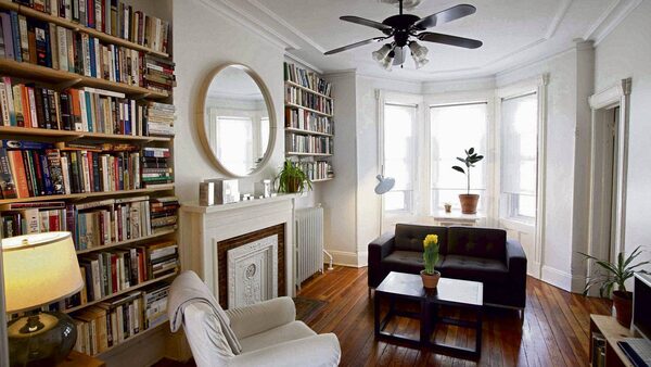 "Our apartment is filled with books, all organized alphabetically and by category. The shelves on the left are dedicated to books on American history, as Brian is pursuing a PhD in the subject. The shelves on the right contain our novels and books of literary criticism. Art history books, artists' monographs, non-fiction, travel and poetry line the walls in the dining room. Brian and I installed the shelves ourselves, but, after a terrifying crash in the night, the fiction shelves had to be reinforced by a hired professional. Oh, the weight of all that prose!"