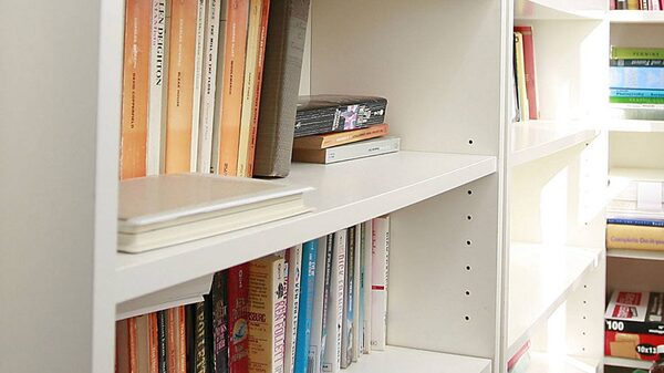 Particle board is never a good option. The pre-drilled holes, as you note, are conspicuous, especially when the finish is white. Filling in the holes won't make it look much better. What's more, if you ever get water in the holes or seams of the board, the material will blow apart. So my answer is yes: Bring on the real wood and paint away. (I prefer poplar for painting because of its smooth finish.) A few notes on bookshelves before you buy (or design built-ins): Their maximum width should be three feet so that they do not bow under the weight of whatever you adorn them with. And I prefer a thick front edge on the shelves – three inches is ideal – for both appearance and function. I also suggest that you pick a shelf height and stick to it – and never drill another hole after that.