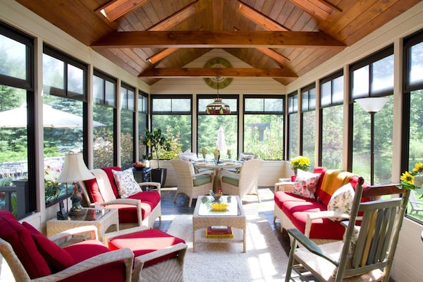 "Every interior should have the punch and pizzazz of a touch of red. In this case, it creates a sense of drama when seen against the different shades of green outside. The material is no-fade Kravet Sunbrella."