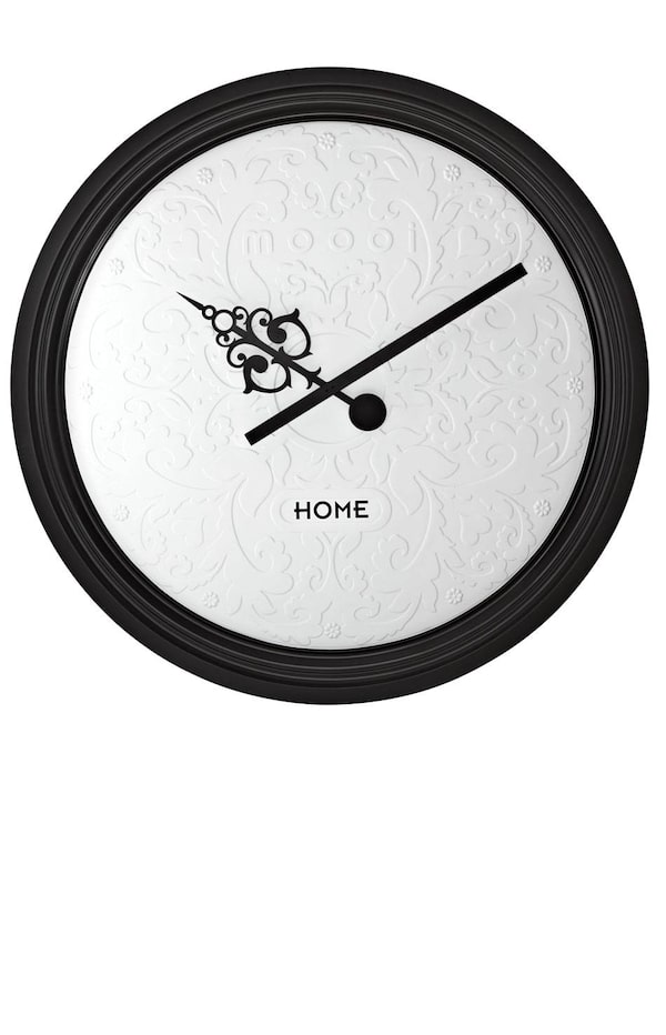 <b>FLOATING DEVICE</b></br> Designed by Aminimal Studio for Umbra, the graphic TIMA wall clock consists of two separate pieces: a metal frame (22 inches in diameter) sprouting Roman numerals and a floating centre that enlists the wall itself as a clock board. $50 (U.S.) through www.umbra.com