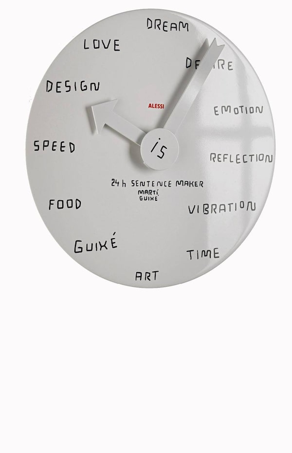 <b>CONCEPT ART</b></br> Whether it’s time for Love, Food, Art or, most intriguingly, Vibration, Marti Guixé’s 15.75-inch, white-aluminum 24 Hour Sentence Maker Wall Clock for Alessi covers a wide range of ways you might choose to spend an hour. $214 at Alessi in Montreal (514-316-4560) and Bergo Designs in Toronto (www.bergo.ca).