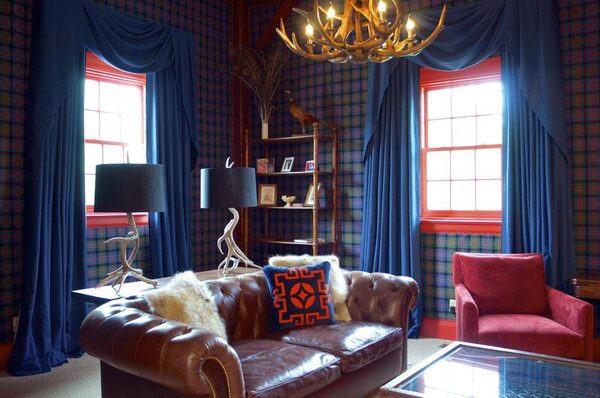 Signature room: I love this room, in a converted mill in Mulmur, Ont., for lots of reasons. It's bold, bright, happy and full of life. The inspiration was ancient Scottish castles with grand yet cozy rooms. We tracked down a mill in Scotland and convinced them to weave the client's family tartan in no time at all. They said no until they said yes, and we upholstered the walls in the gorgeous wool tartan. We used a huge button-backed leather sofa, from Montauk, love to go local.