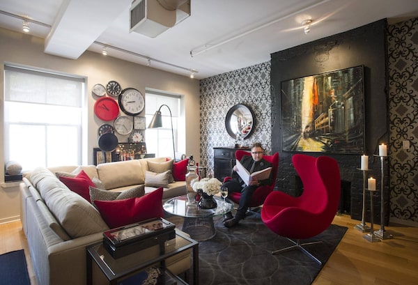 Jamie Alexander likes walking to work, so five years ago he purchased a 560-square-foot loft located near the Peloso Alexander interior-design business and retail store he co-owns and operates in Toronto's King Street East furniture district. A former concierge for Fairmont Hotels & Resorts who grew up in Moncton, NB, Alexander oversaw the four-month-long renovation that transformed his small corner of a former munitions factory into a well-dressed home to share with his hairdresser-husband, Joshua Breau, and their dog. The reno involved tearing down walls, which revealed a fireplace that now features prominently in the living room, Alexander's favourite room, where he likes to entertain. "We've had parties of up to 40 people here," he says of the fluid space that "people like to congregate in. Believe it or not, we have the room."